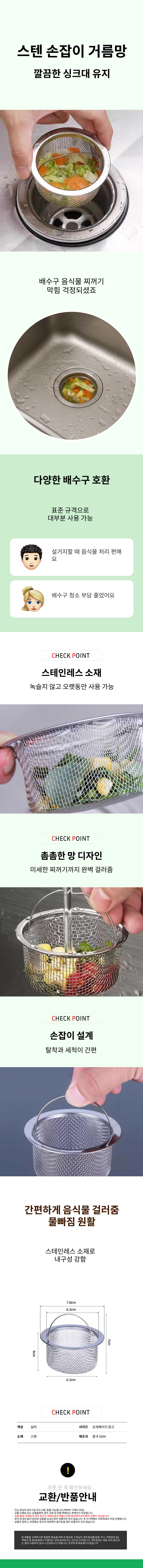싱크대 배수구 거름망 스텐 손잡이 음식물 개수대망