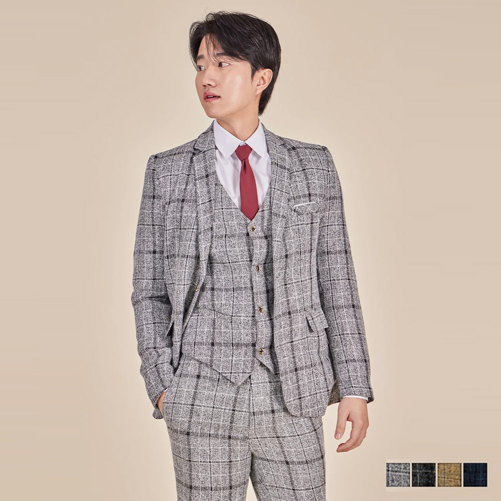 (대여)댄디 체크 남자 자켓 조끼 바지 정장세트.