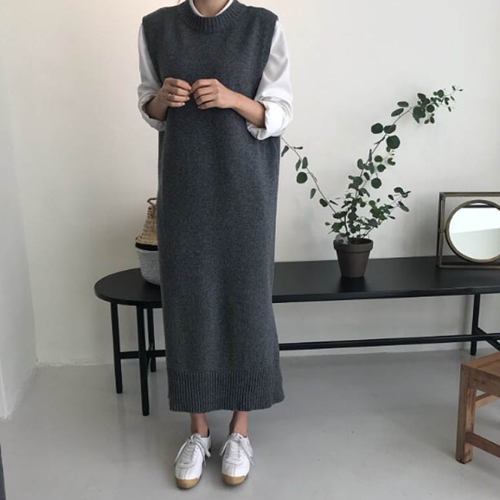 편안한 원피스 레이어드 롱조끼 라운드넥 니트 소재