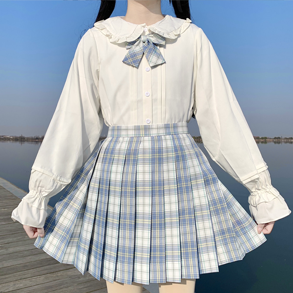 스카이블루 체크 긴팔 프릴 블라우스 세라복 교복세트.