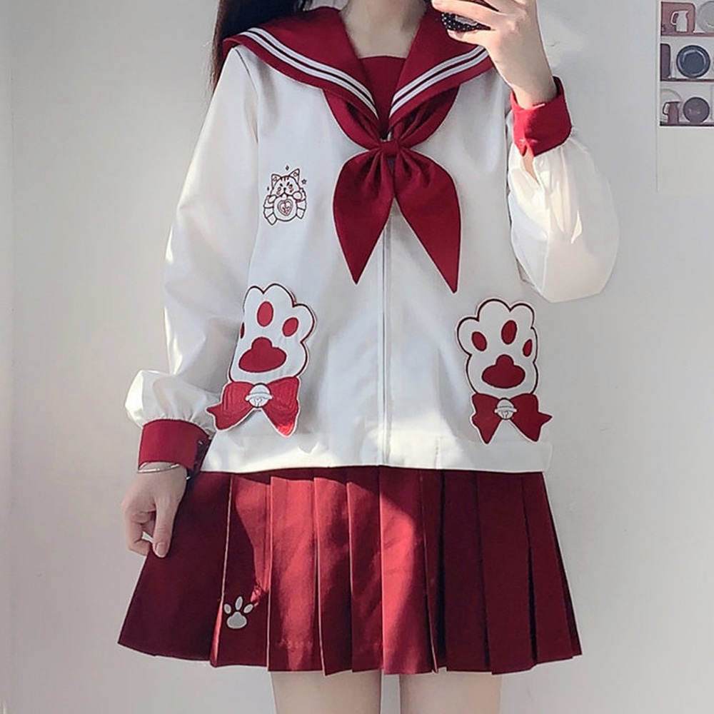 화이트레드 배색 고양이 세라복세트(상의 타이 치마).