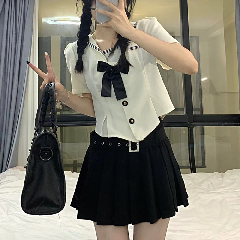아이보리 퍼프절개 반팔 버클치마 세라복 교복세트.
