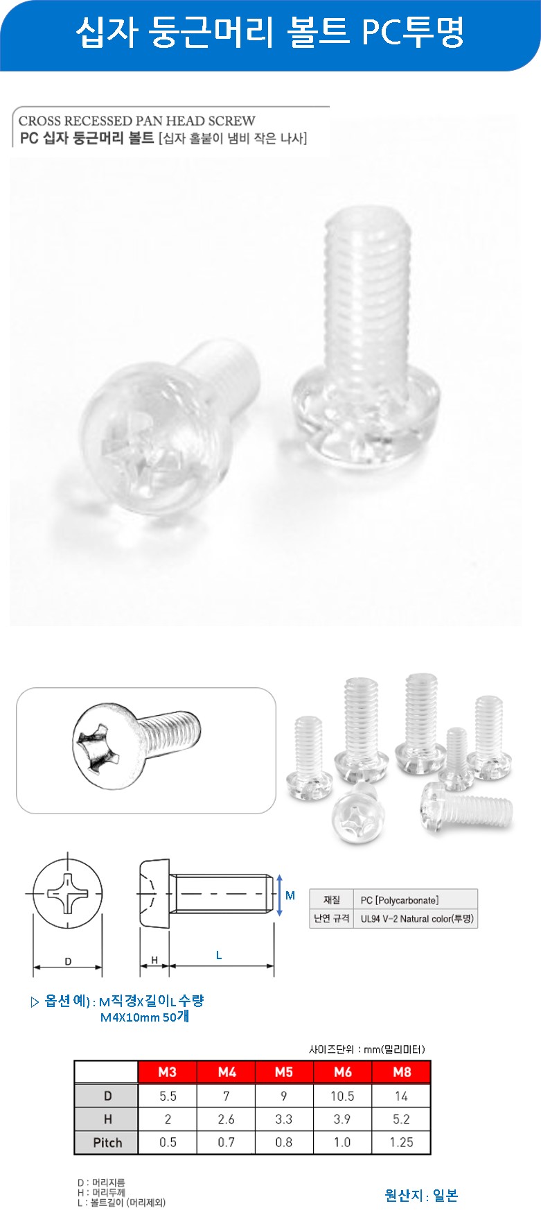 십자 둥근머리 볼트 PC 투명 M5x10mm 1000개