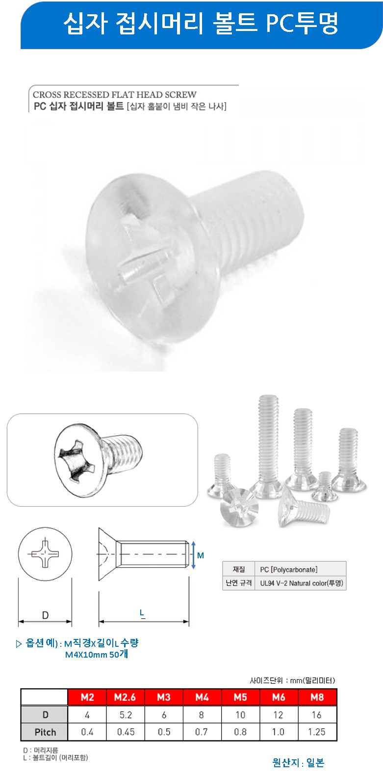 십자 접시머리 볼트 PC 투명 M6x25mm 250개