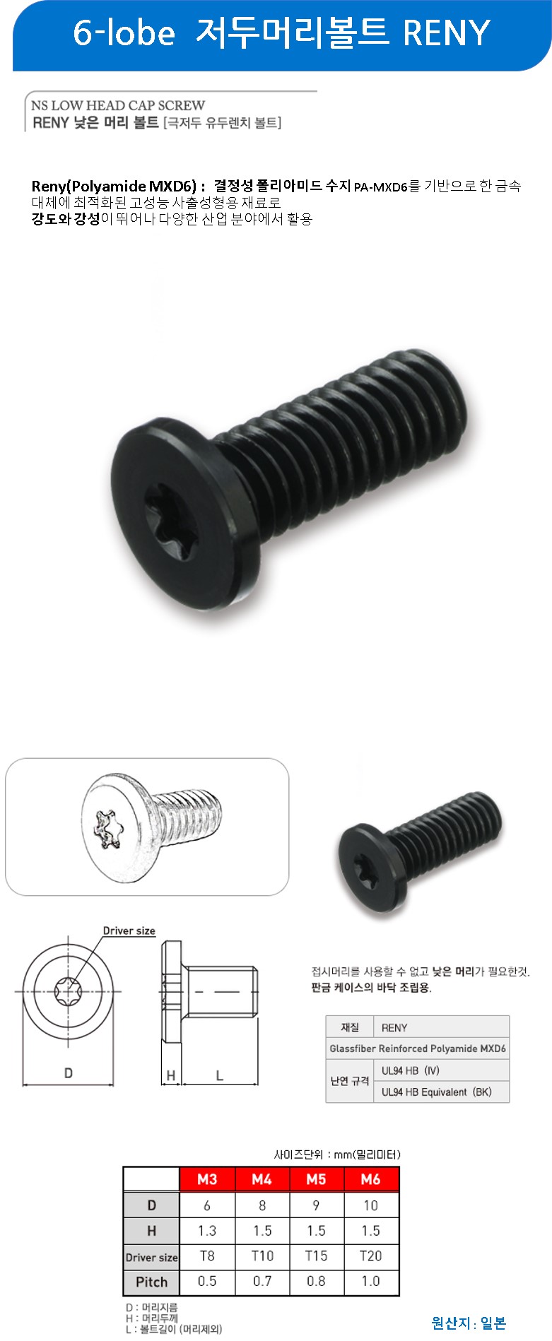 6-lobe 저두머리볼트 RENK 흑색 M6x12mm 20개