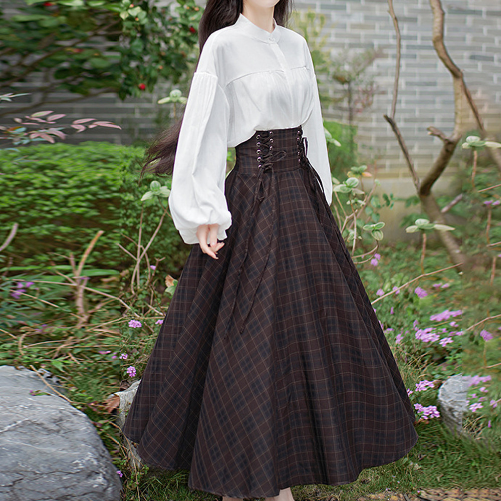 브라운체크 프렌치 레트로 경성의상 긴팔 투피스 세트.