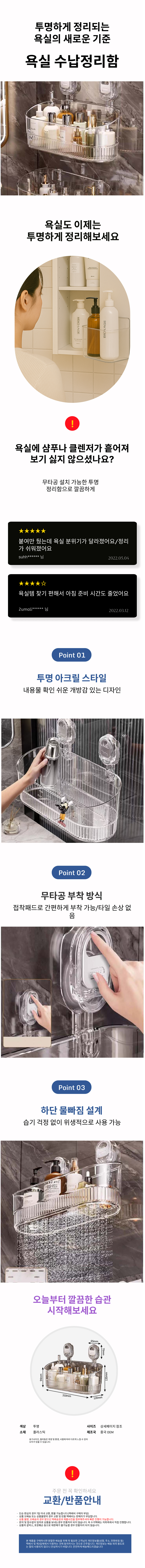 흡착 투명 아크릴 욕실 정리 수납 바스켓 하단 물빠짐