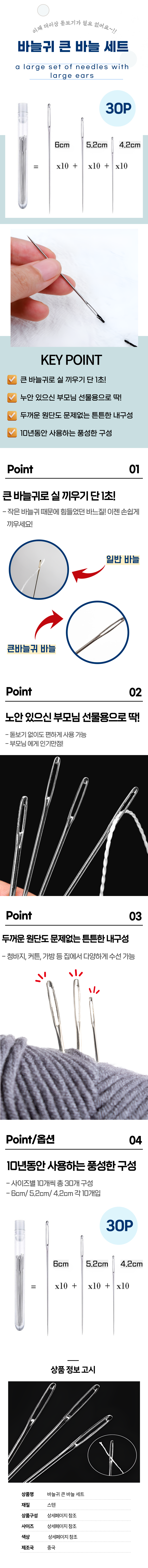 실꿰기 편한 바늘 세트 30p 귀큰바늘 손쉬운 큰구멍 실꿰기 실넣기 편한 니들