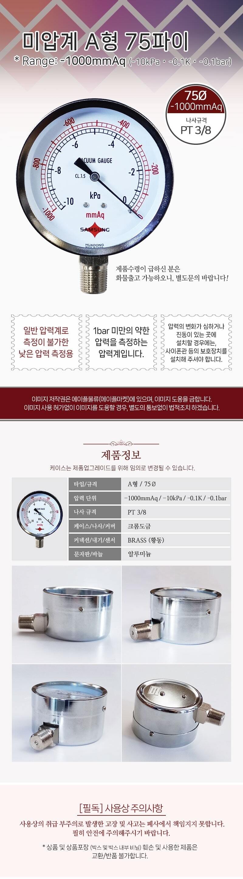 NEW A형 75파이 미압계 -1000mmAq PT3/8 낮은 압력 측정용 1bar미만 측정