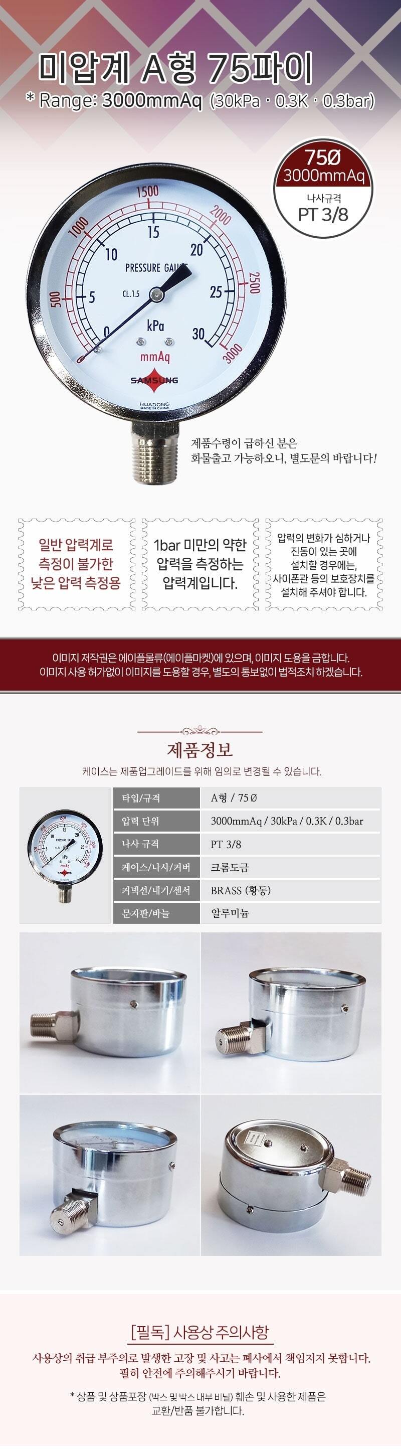 NEW A형 75파이 미압계 3000mmAq PT3/8 낮은 압력 측정용 1bar미만 측정