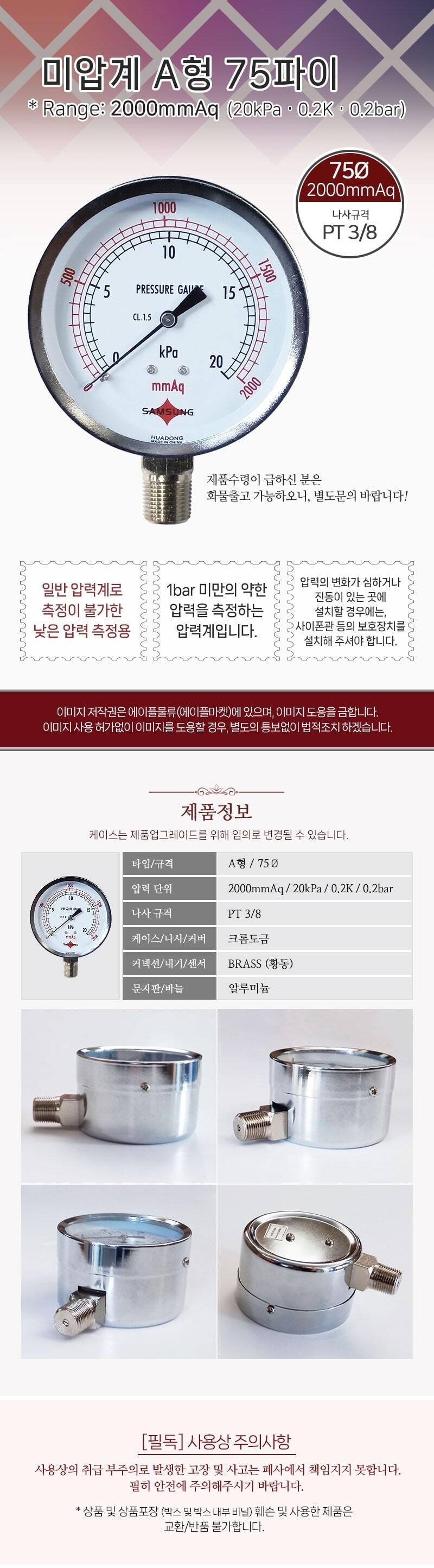 NEW A형 75파이 미압계 2000mmAq PT3/8 낮은 압력 측정용 1bar미만 측정