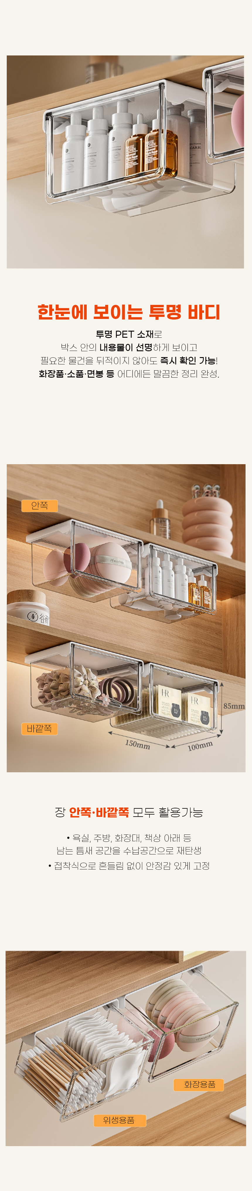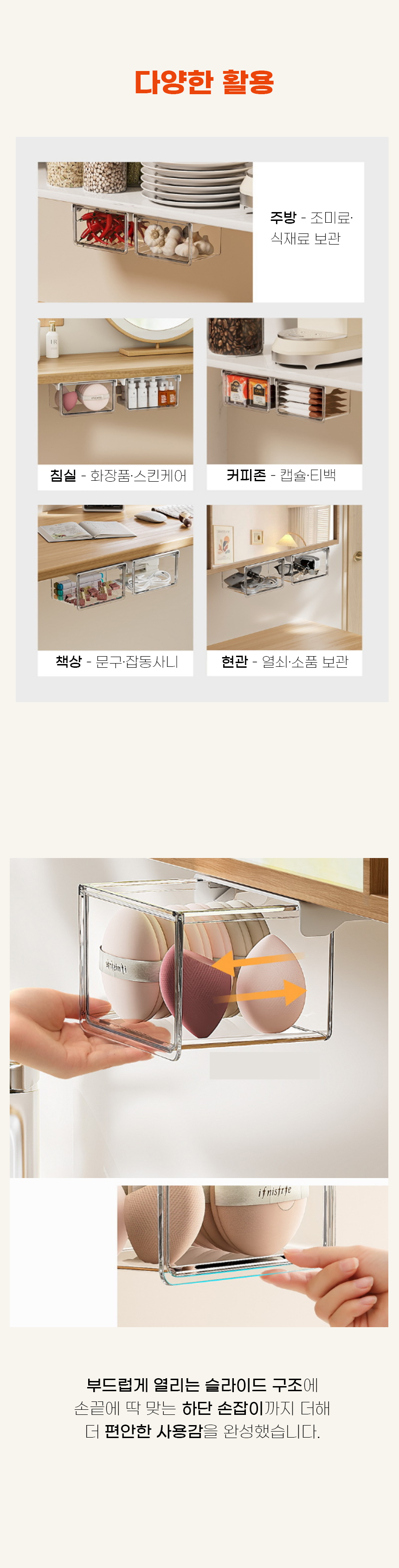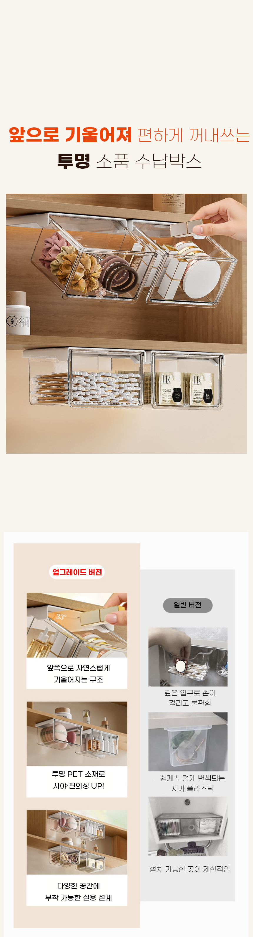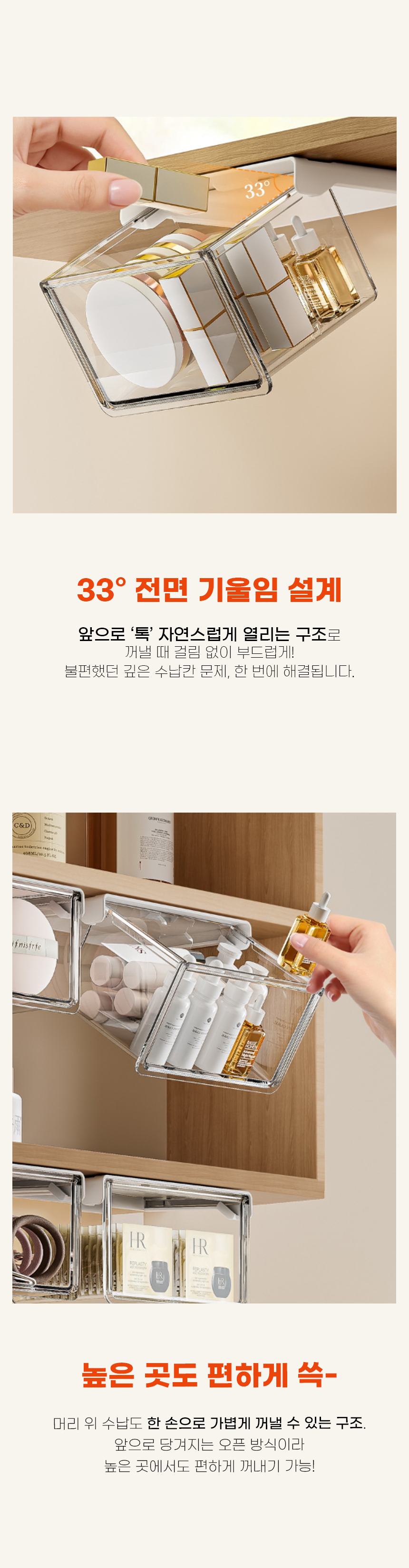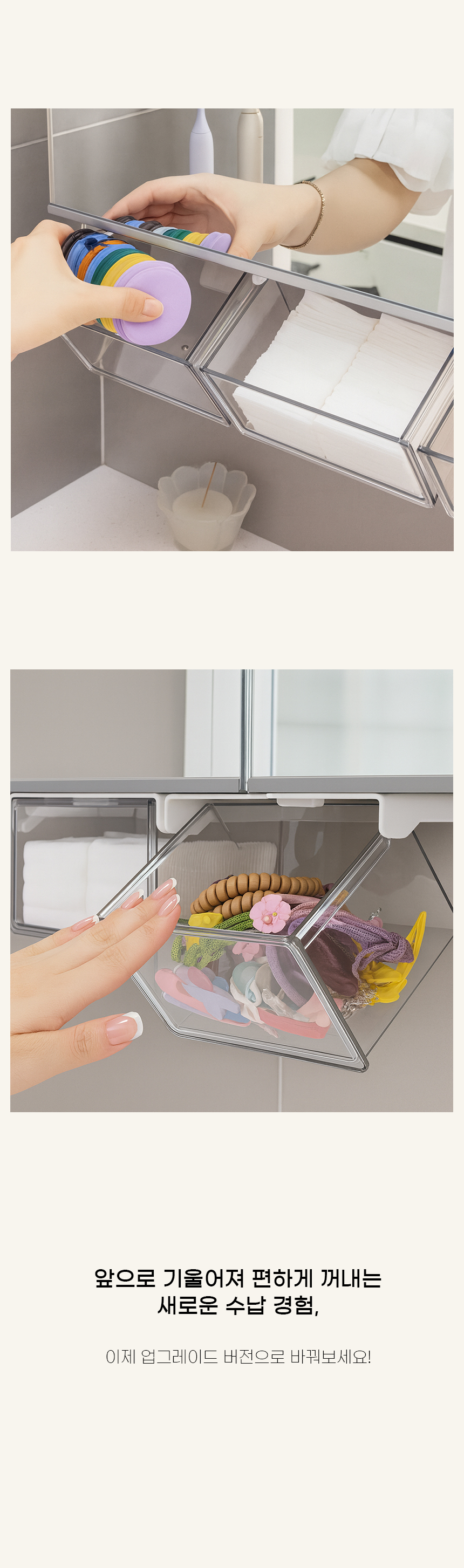 앞으로 내려와 편하게 사용되는 투명 소품함