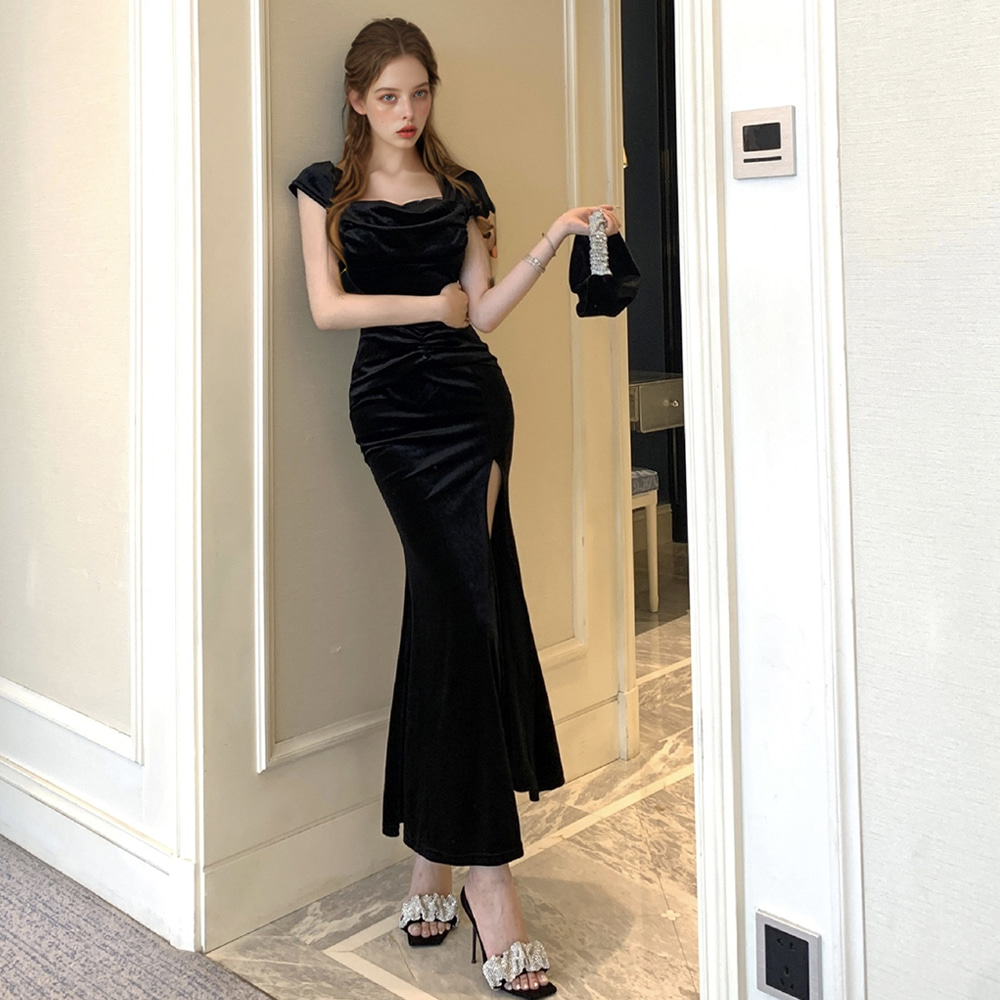 (대여) 블랙 드레이프 넥라인 컷아웃 디테일 벨벳.