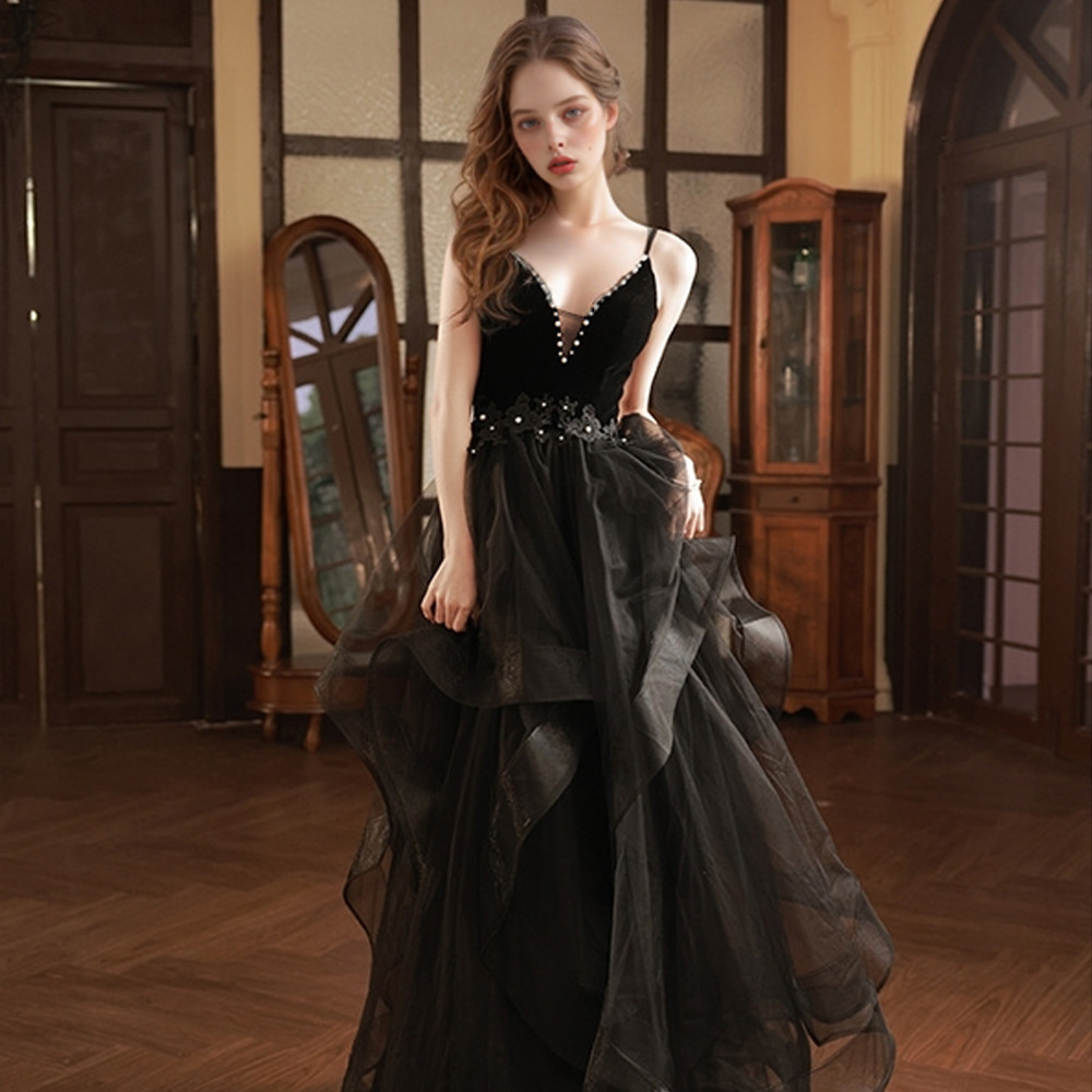 블랙 오팔 펄장식 슬리브리스 벨벳 시스루 드레스 교.