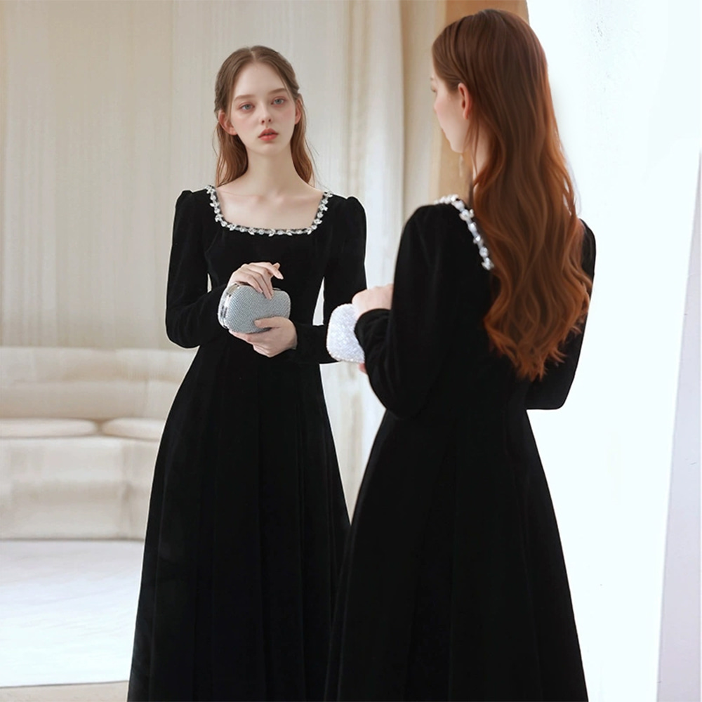 (대여) 블랙벨벳 스퀘어넥 실버 플라워라인 퍼프숄더.