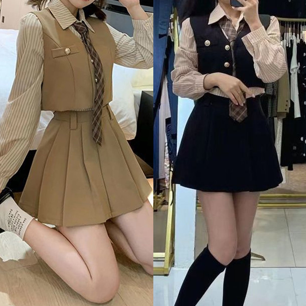 3버튼 크롭조끼 스트라이프 긴팔 프레피 세라복 세트.