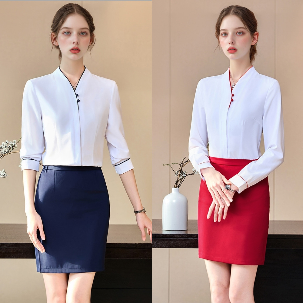 화이트 심플 V라인 블라우스 H라인 스커트 유니폼.