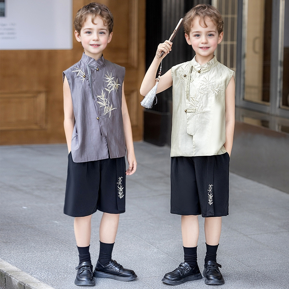 하이넥 창파오 대나무 자수 공연 무대의상 세트.