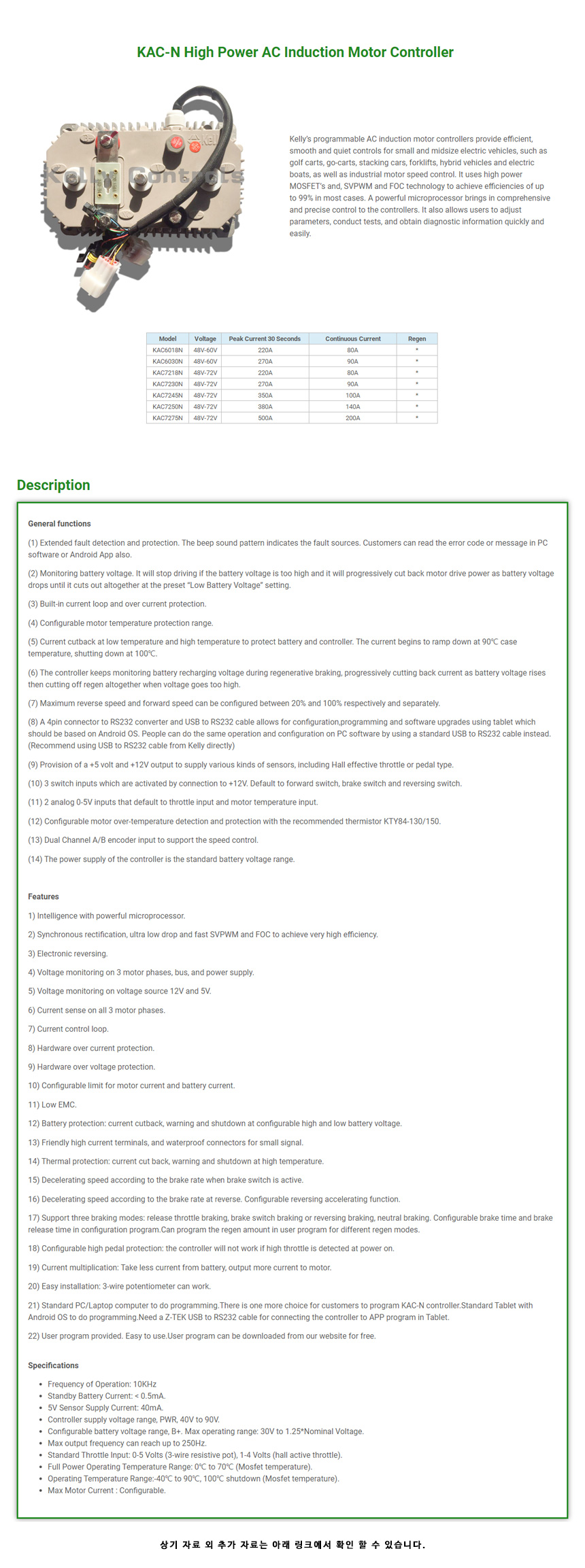 Kelly 고전력 SVPWM AC 인덕션 모터 컨트롤러 회생제동 48V-72V 90A (KAC7230N)