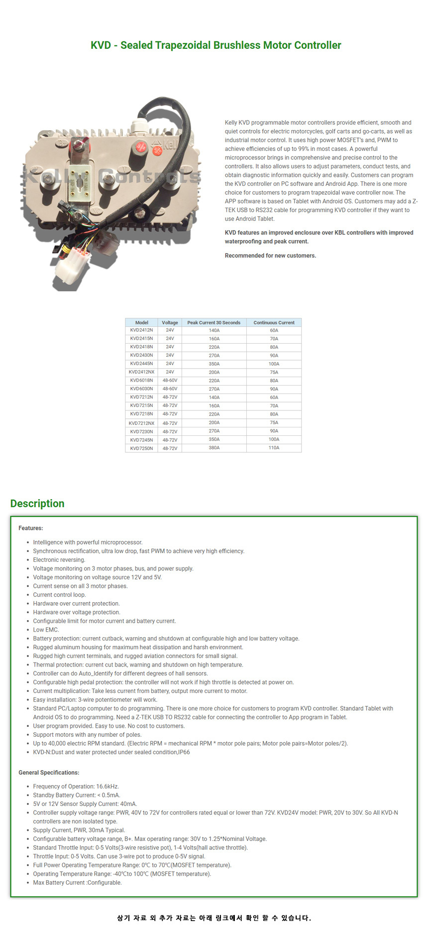 Kelly 밀폐형 사다리꼴 BLDC 모터 컨트롤러 48V-60V 90A (KVD6030N)
