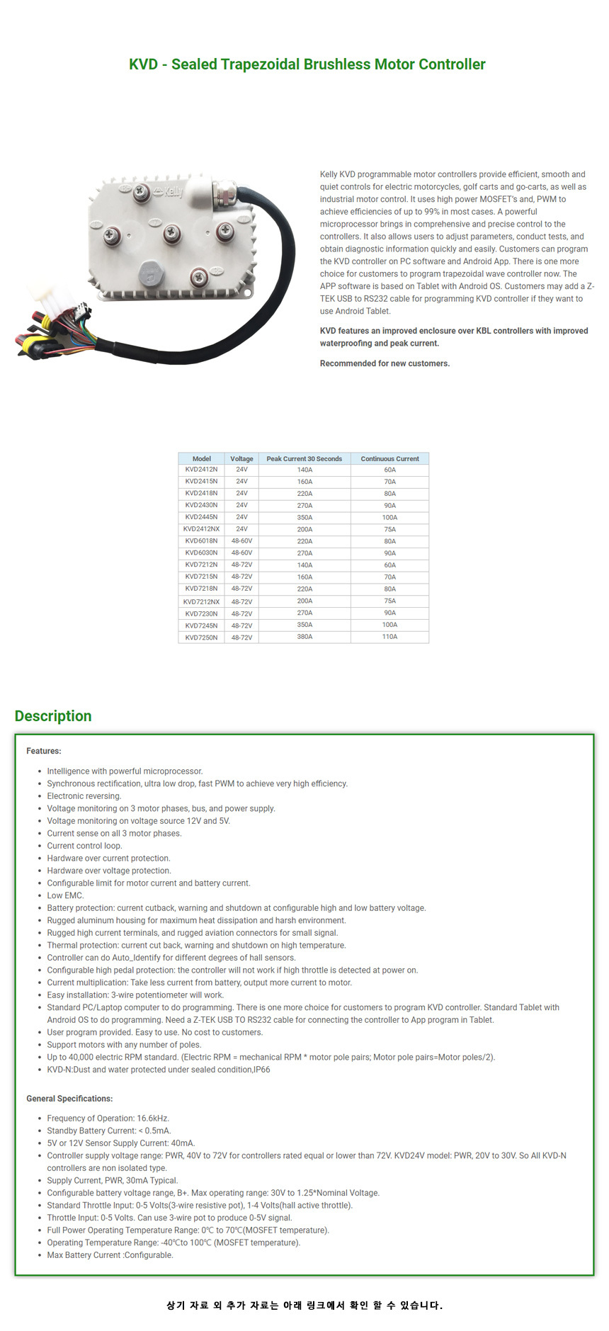 Kelly 밀폐형 사다리꼴 BLDC 모터 컨트롤러 24V 70A (KVD2415N)