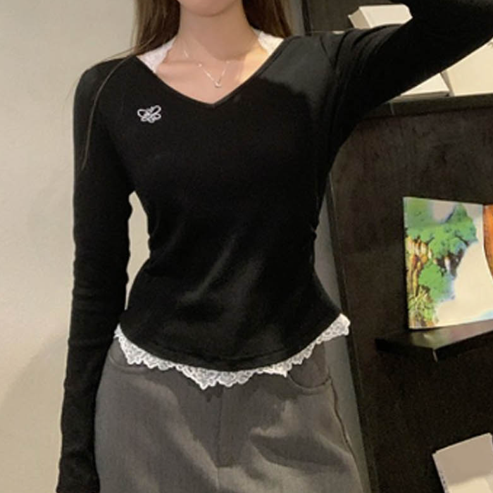 슬림해보이는 세련된 티셔츠 브이넥 레이스 긴팔티