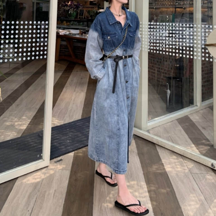 셔츠형 드레스 투톤 워싱 벨트 포함 빈티지 데님 원피스